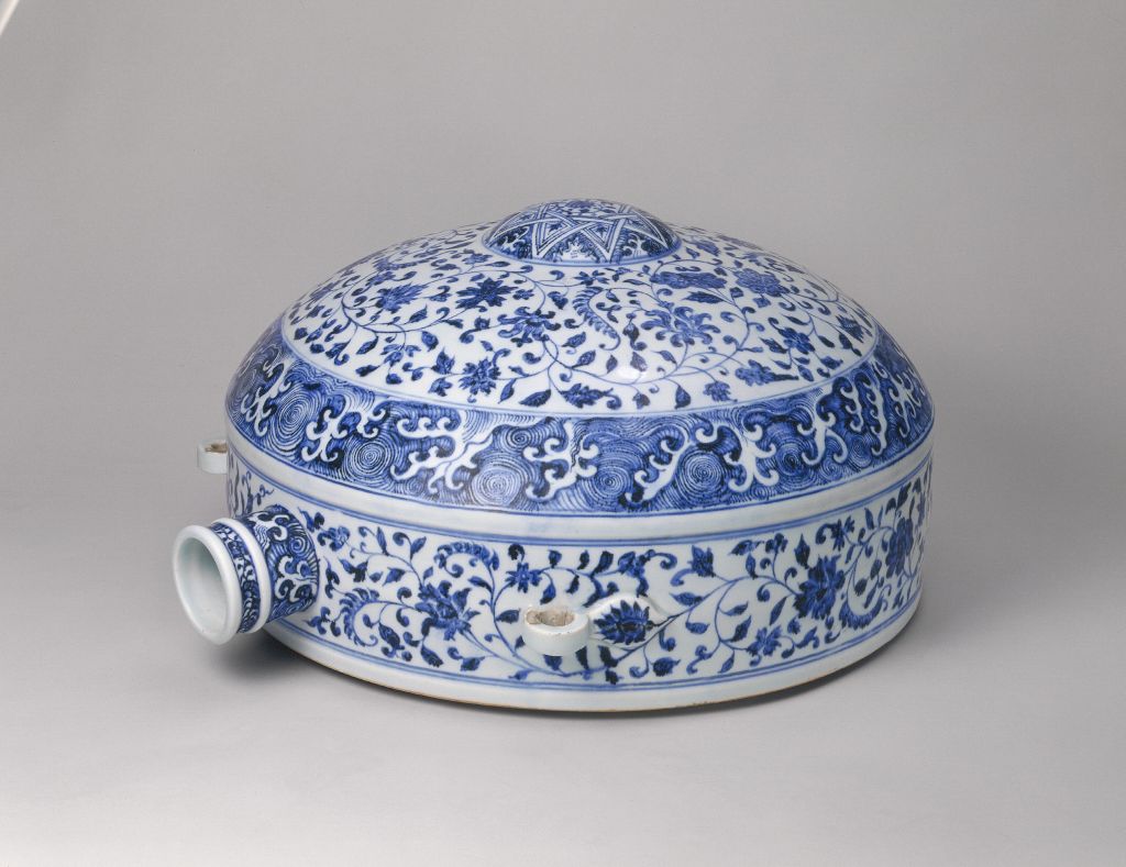 此壶纹饰精美,式样别致,是当时受西亚金属器皿的影响而烧制的新器型。瓷器釉彩之一,被用作白地蓝花瓷的专称。因蓝花在釉下,所以青花属釉下彩。其原料为含氧化钴的钴土矿,以蓝青色料在瓷胎上描绘纹饰,然后施透明釉,在高温还原焰中一次烧成。元代景德镇已能烧制成熟的青花瓷器。青花瓷器的盛行改变了青瓷为主的局面,成为明、清两代中国瓷器生产的主流。