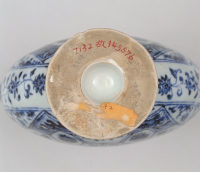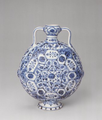 青花花卉锦纹双耳扁瓶,明永乐,高24.3厘米,口径3.5厘米,足径7.4厘米。