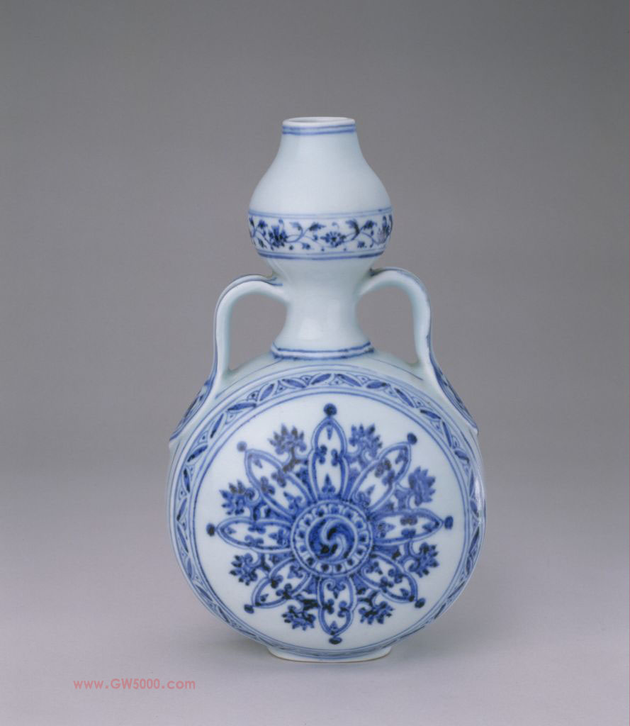 青花双耳葫芦式扁瓶,明永乐,高25.2厘米,口径3.3厘米,足径6厘米。