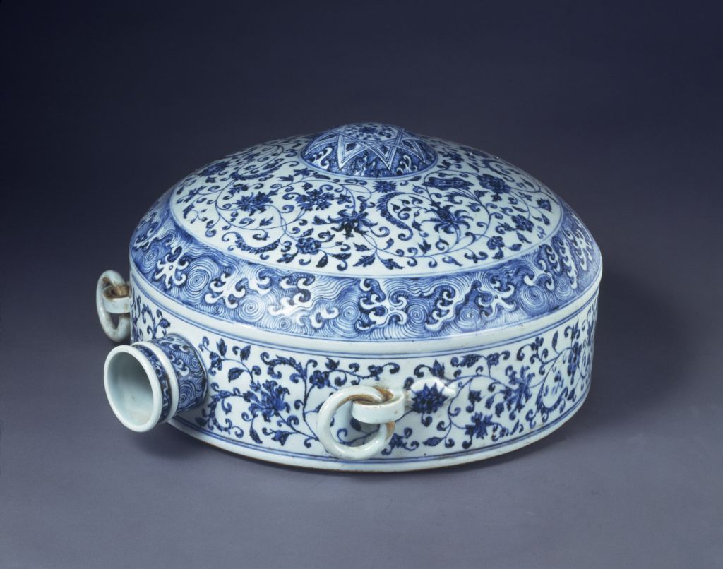 此器造型独特,形体硕大,状若乌龟,是受西亚文化影响摹仿阿拉伯铜器造型而烧制的,又称“卧壶”。瓷器釉彩之一,被用作白地蓝花瓷的专称。因蓝花在釉下,所以青花属釉下彩。其原料为含氧化钴的钴土矿,以蓝青色料在瓷胎上描绘纹饰,然后施透明釉,在高温还原焰中一次烧成。元代景德镇已能烧制成熟的青花瓷器。青花瓷器的盛行改变了青瓷为主的局面,成为明、清两代中国瓷器生产的主流。