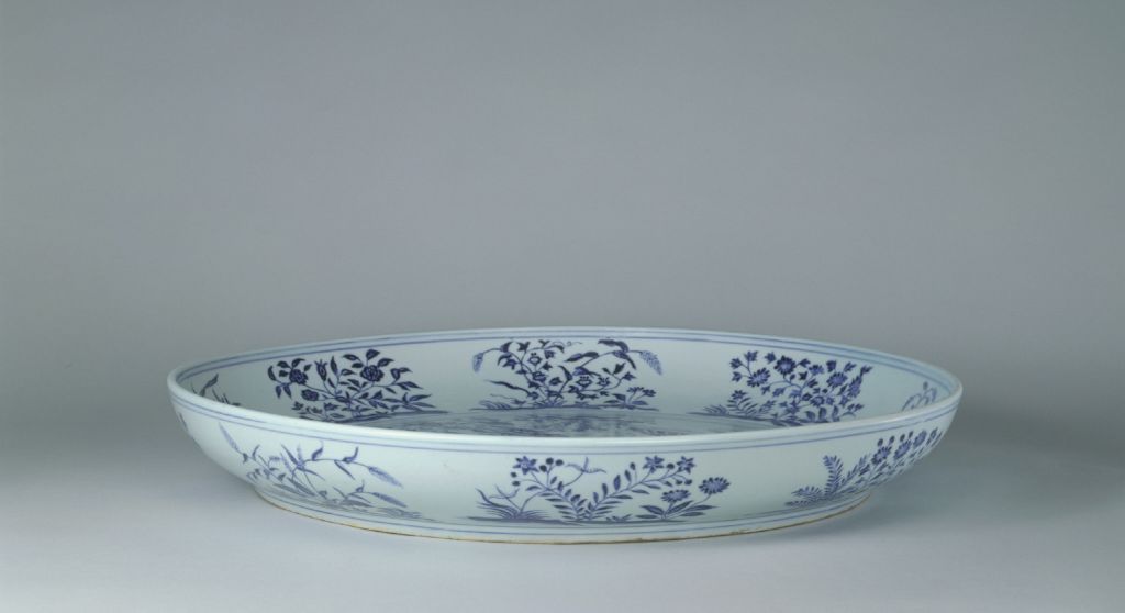 青花园景花卉纹盘,明永乐,高9.2厘米,口径63厘米,足径48.6厘米。