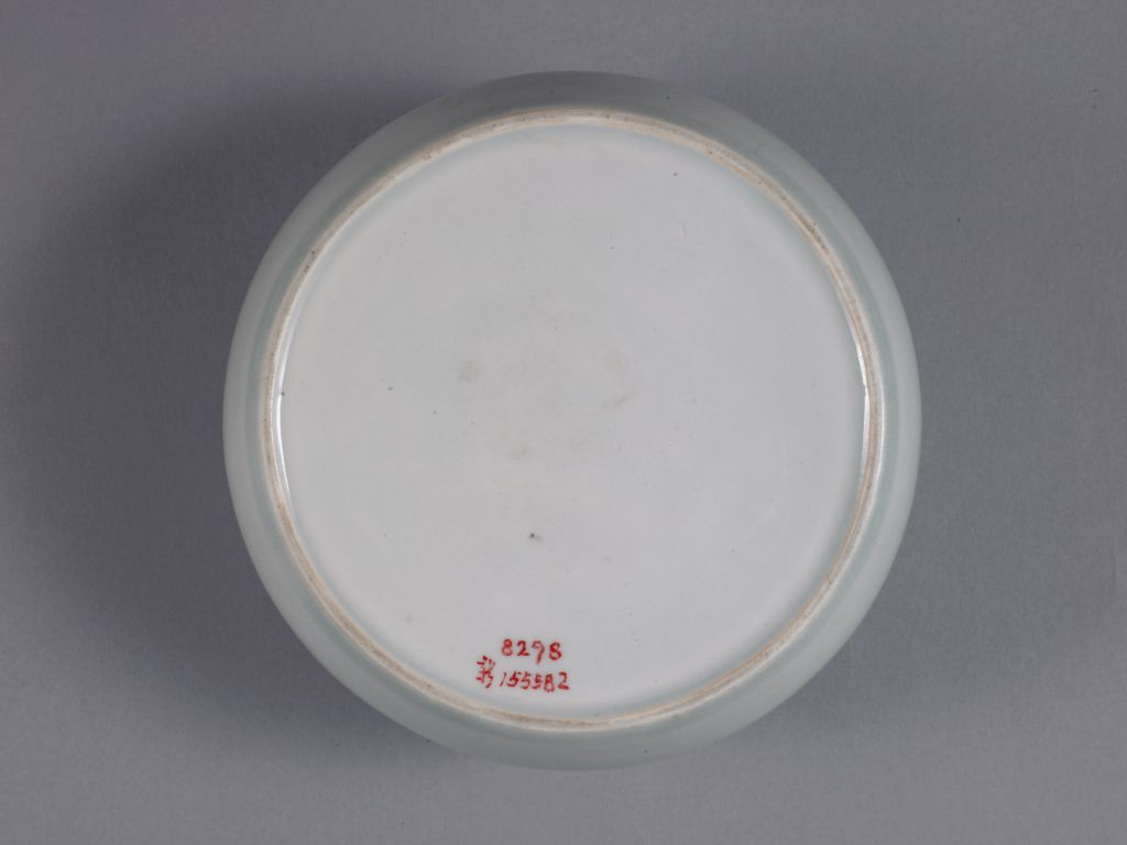 翠青釉罐,明永乐,高8.5厘米,口径8.8厘米,足径12.3厘米。