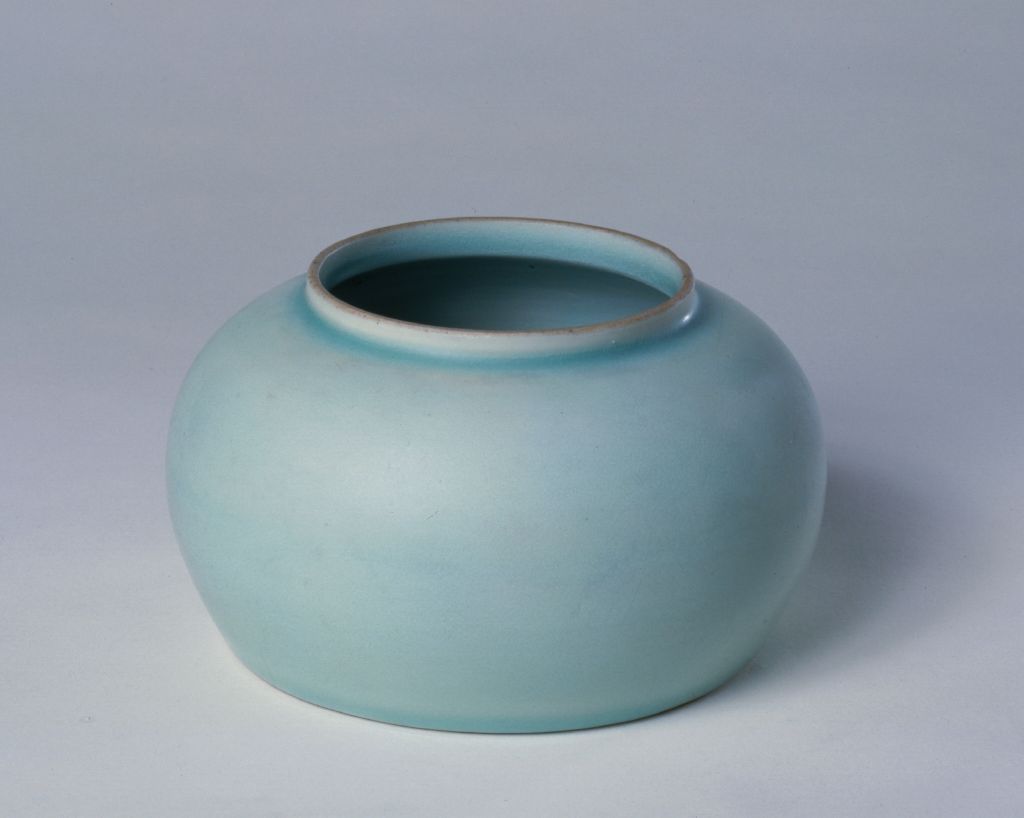 罐广口,短颈,溜肩,鼓腹,浅圈足。里外及圈足内均施翠青釉,釉面莹亮润泽,色调清新淡雅,口边和足边积釉处呈青绿色。无款识。