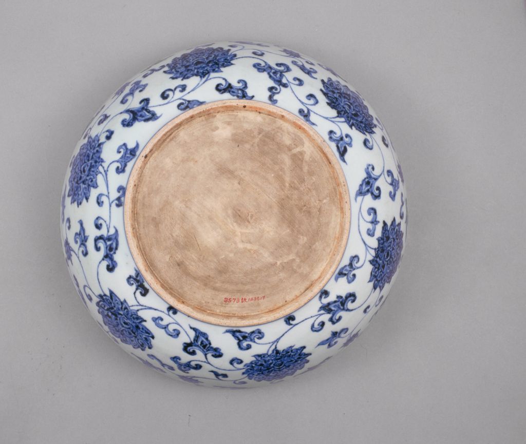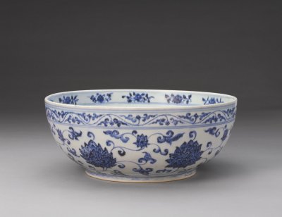 青花缠枝莲纹碗,明永乐,高13.7厘米,口径35.5厘米,足径20厘米。清宫旧藏。