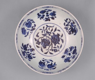 此碗形制颇大,花果描绘生动,石榴寓意“多子多福”。瓷器釉彩之一,被用作白地蓝花瓷的专称。因蓝花在釉下,所以青花属釉下彩。其原料为含氧化钴的钴土矿,以蓝青色料在瓷胎上描绘纹饰,然后施透明釉,在高温还原焰中一次烧成。元代景德镇已能烧制成熟的青花瓷器。青花瓷器的盛行改变了青瓷为主的局面,成为明、清两代中国瓷器生产的主流。