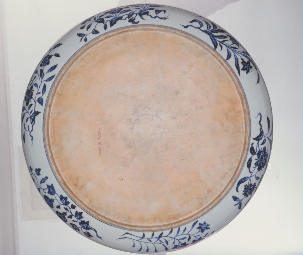 此盘虽硕大,但形体规整,构图雅致,青花发色浓艳。瓷器釉彩之一,被用作白地蓝花瓷的专称。因蓝花在釉下,所以青花属釉下彩。其原料为含氧化钴的钴土矿,以蓝青色料在瓷胎上描绘纹饰,然后施透明釉,在高温还原焰中一次烧成。元代景德镇已能烧制成熟的青花瓷器。青花瓷器的盛行改变了青瓷为主的局面,成为明、清两代中国瓷器生产的主流。