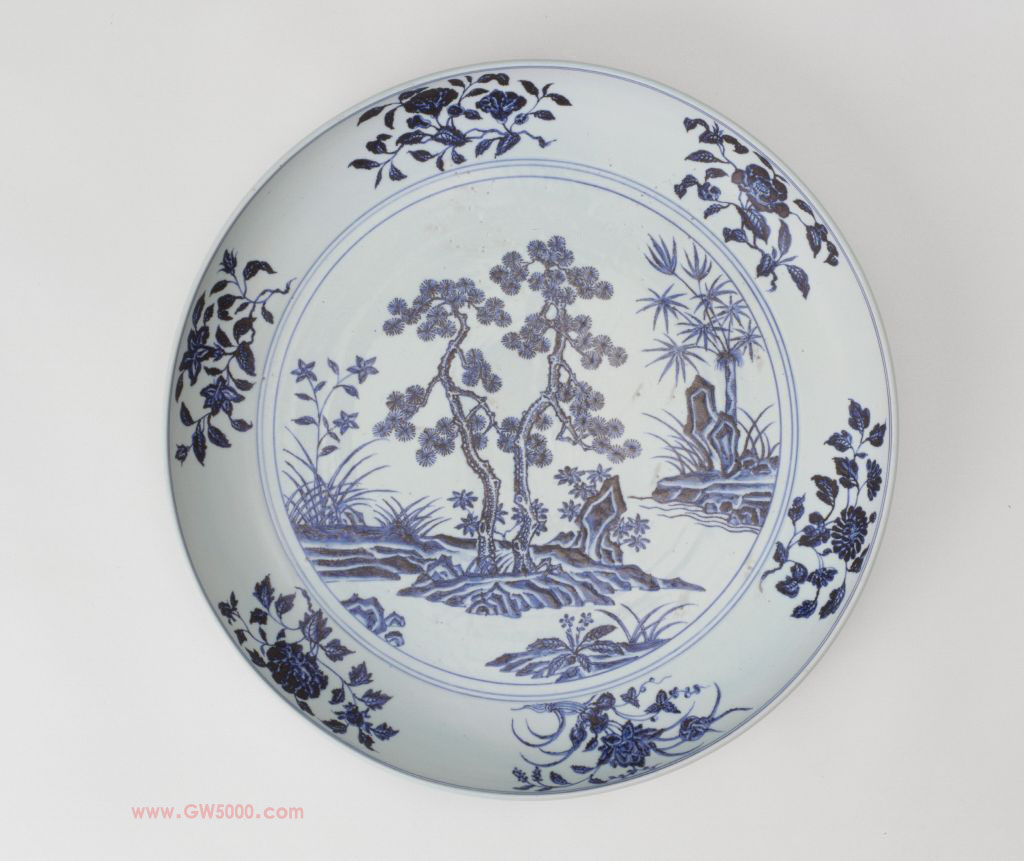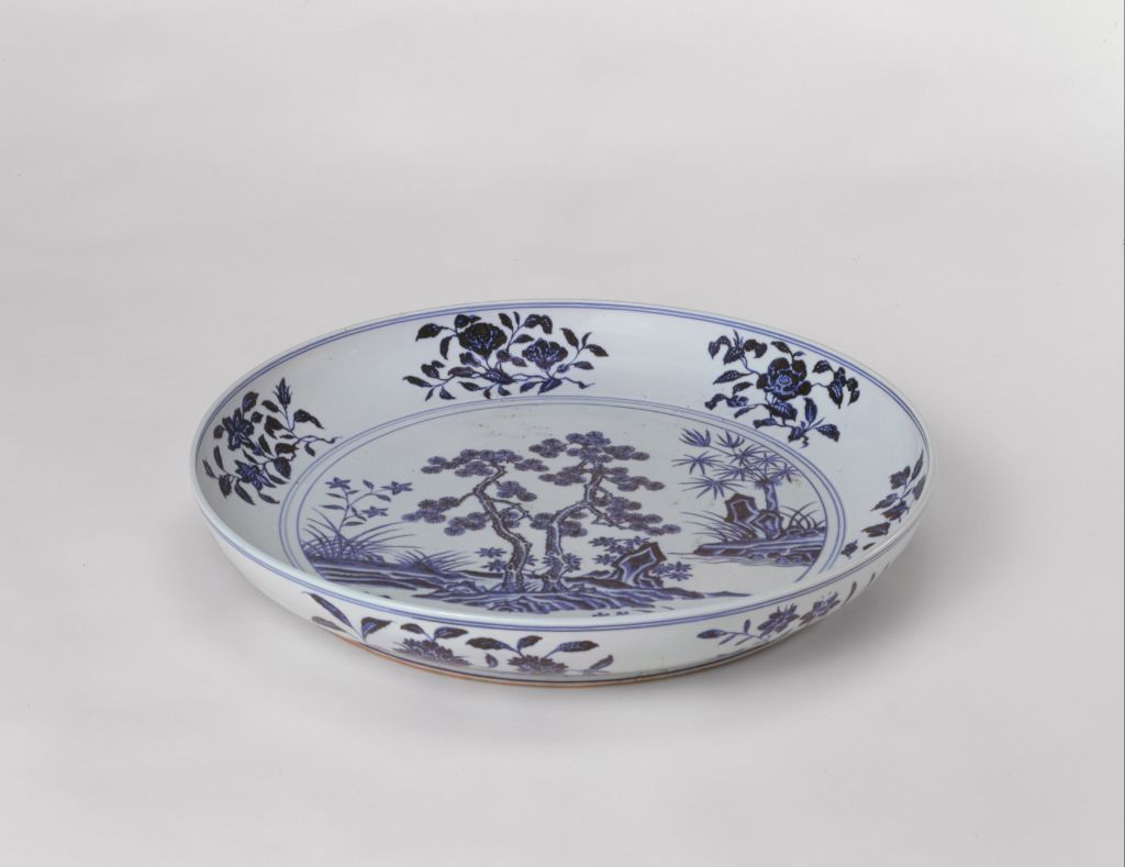 青花园景花卉纹盘,明永乐,高8.5厘米,口径63.5厘米,足径49.5厘米。清宫旧藏。