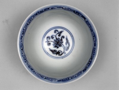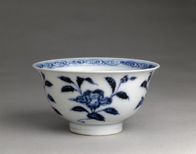 碗撇口,弧壁,圈足。通体青花纹饰。碗心双圈内饰勾莲纹,里口沿饰忍冬纹,外壁饰折枝山茶花纹。纹饰简洁、清新而明快。瓷器釉彩之一,被用作白地蓝花瓷的专称。因蓝花在釉下,所以青花属釉下彩。其原料为含氧化钴的钴土矿,以蓝青色料在瓷胎上描绘纹饰,然后施透明釉,在高温还原焰中一次烧成。元代景德镇已能烧制成熟的青花瓷器。青花瓷器的盛行改变了青瓷为主的局面,成为明、清两代中国瓷器生产的主流。