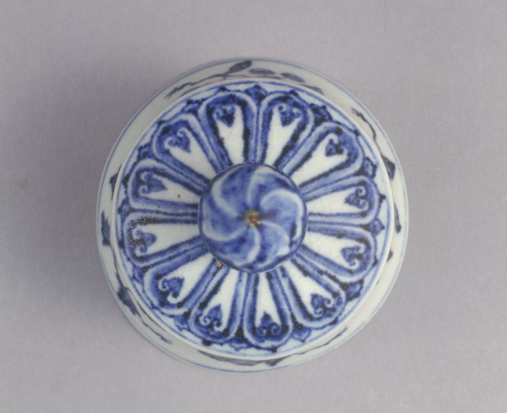 瓶小口卷唇,短颈,丰肩,敛腹。瓶盖上有宝珠钮。通体青花纹饰,肩饰仰覆如意云头纹,如意头内饰折枝花纹,腹饰折枝果纹,近足处饰变形上仰莲瓣纹和忍冬纹。盖面饰下垂蕉叶纹,盖壁饰花叶纹。