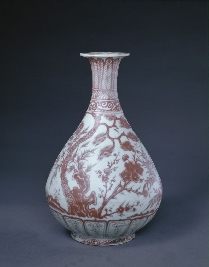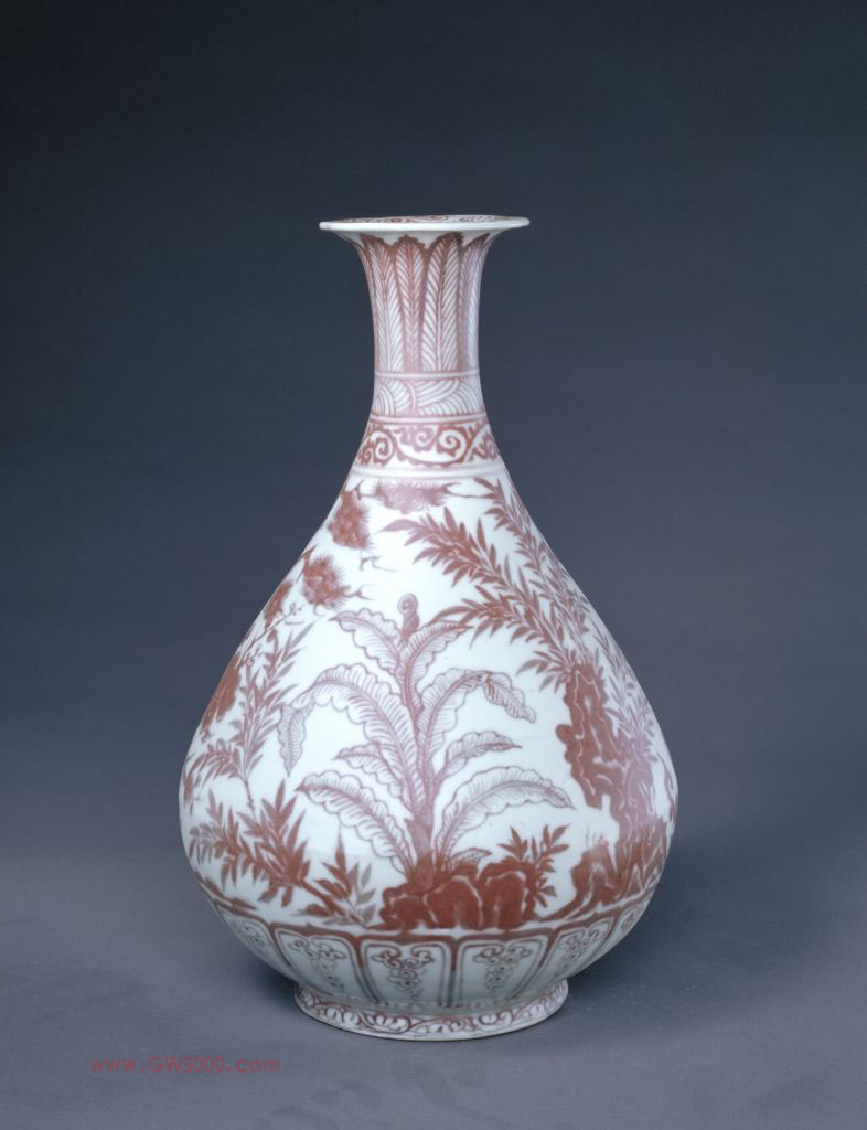 釉里红是元代景德镇窑创烧的一个品种,烧成难度大。此件玉壶春瓶继承元代釉里红的烧制技术,红呈色较纯正,纹饰清晰,是明初景德镇釉里红之佳作。釉下彩品种之一,系以氧化铜为呈色剂在胎上彩绘,然后施釉,经高温一次烧成。因其在釉下彩绘,故称釉里红。釉里红的白地红花,色彩鲜艳,给人以热烈喜庆的感受,自元代创烧以来,一直受到人们的喜爱。由于铜对窑室内的气氛要求严格,高温下易挥发,因此烧成难度大。元与明初的制品有些呈色不稳定。明、清时烧制的釉里红色彩稳定,且更加艳丽,尤其是清雍正朝的釉里红,不仅色泽鲜红,而且成品率高。<br>以“玉壶先春”得名,指造型为撇口、细颈、硕腹、圈足的瓶式。玉壶春瓶以随时代变化而不同的弧线构成柔和匀称的瓶体,时代特征明显。隋代已经出现。宋代定窑、龙泉窑、景德镇窑、汝窑、耀州窑、钧窑都有烧制。玉壶春瓶亦有带盖者。与早期相比,明、清景德镇窑制品胎薄体轻,釉色莹润,有青花、釉里红、五彩、斗彩、粉彩、素三彩诸多品种,非常精美。宋至元代玉壶春瓶用做酒器,明、清时渐变为陈设瓷。<br>装饰纹样的一种。一端尖锐,一端较宽,作蕉叶的形式。蕉是“芭蕉”的略称,蕉叶即芭蕉叶。