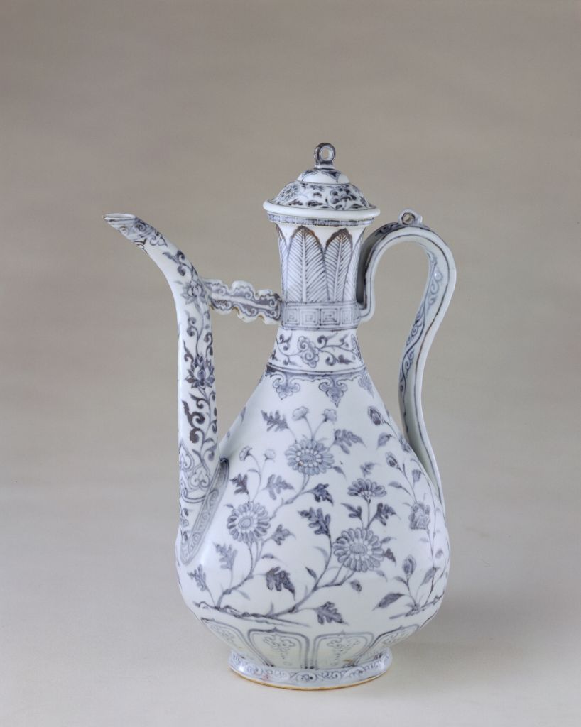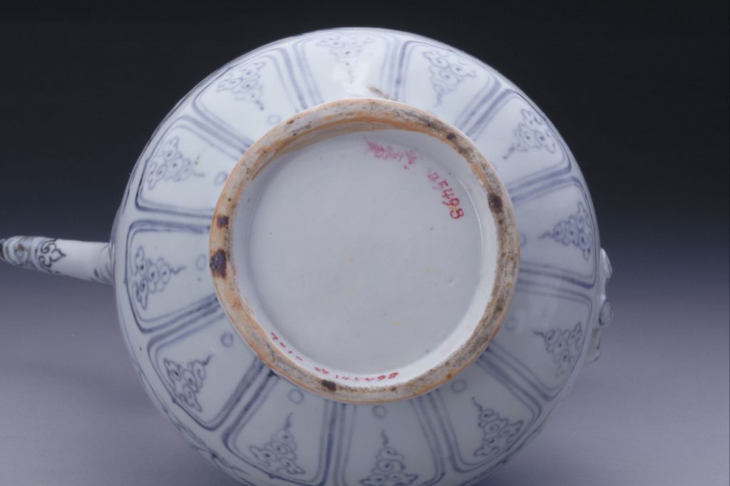 壶撇口,细长颈,斜肩,丰腹,下部饱满,圈足。一侧置长流,流与颈间连以横片。另一侧置曲柄,连于颈、腹之间。通体青花装饰,口沿下饰回纹,颈部自上而下依次为蕉叶纹、回纹、缠枝灵芝纹、如意云头纹各一周,腹部绘菊花纹和山茶花纹,近足处绘莲瓣纹,流及柄均绘缠枝花卉纹。壶附盖,盖面绘缠枝花纹。圈足内施白釉。无款识。