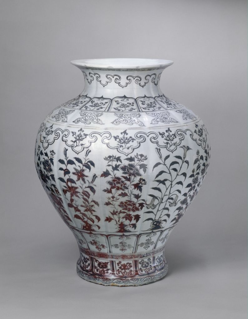 釉里红四季花卉纹石榴尊,明洪武,高53厘米,口径26.5厘米,足径23.2厘米。