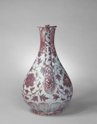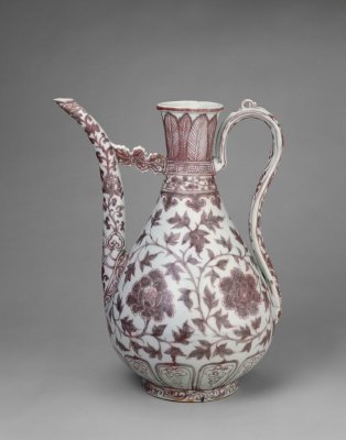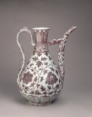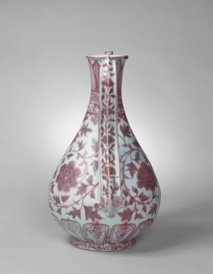 明洪武时期的釉里红瓷器多为大盘、大碗、大罐、玉壶春瓶、梅瓶、执壶等大件器物,纹饰以各种缠枝、折枝和串枝花卉为主,此外还有松竹梅、庭院芭蕉及龙凤等纹饰。此时期的釉里红发色不甚鲜艳,多为红中偏灰黑的色调,此壶发色较为鲜艳纯正,是一件难得的珍品。釉下彩品种之一,系以氧化铜为呈色剂在胎上彩绘,然后施釉,经高温一次烧成。因其在釉下彩绘,故称釉里红。釉里红的白地红花,色彩鲜艳,给人以热烈喜庆的感受,自元代创烧以来,一直受到人们的喜爱。由于铜对窑室内的气氛要求严格,高温下易挥发,因此烧成难度大。元与明初的制品有些呈色不稳定。明、清时烧制的釉里红色彩稳定,且更加艳丽,尤其是清雍正朝的釉里红,不仅色泽鲜红,而且成品率高。<br>中国传统装饰花纹之一。所绘花朵系以植物的枝干或蔓藤作骨架,枝叶相互缠绕,构成四方连续或二方连续的图案,统一中寓变化。有缠枝莲、缠枝菊、缠枝牡丹和缠枝宝相花等多种纹样。