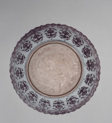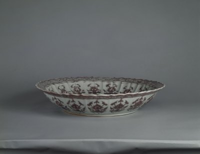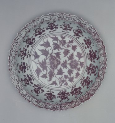 明洪武釉里红器装饰以植物题材为主,其植物种类之繁多,内容之新奇,是以前各时期所无法比拟的。这件洪武釉里红大盘纹饰富丽多彩,釉面发色纯正鲜艳,较好地体现了明初釉里红的烧制成就,在品种、数量都不甚多的明初釉里红器中堪称珍品。