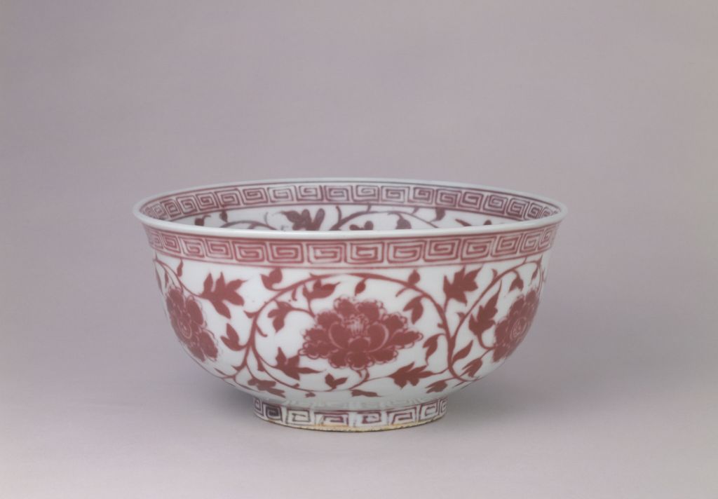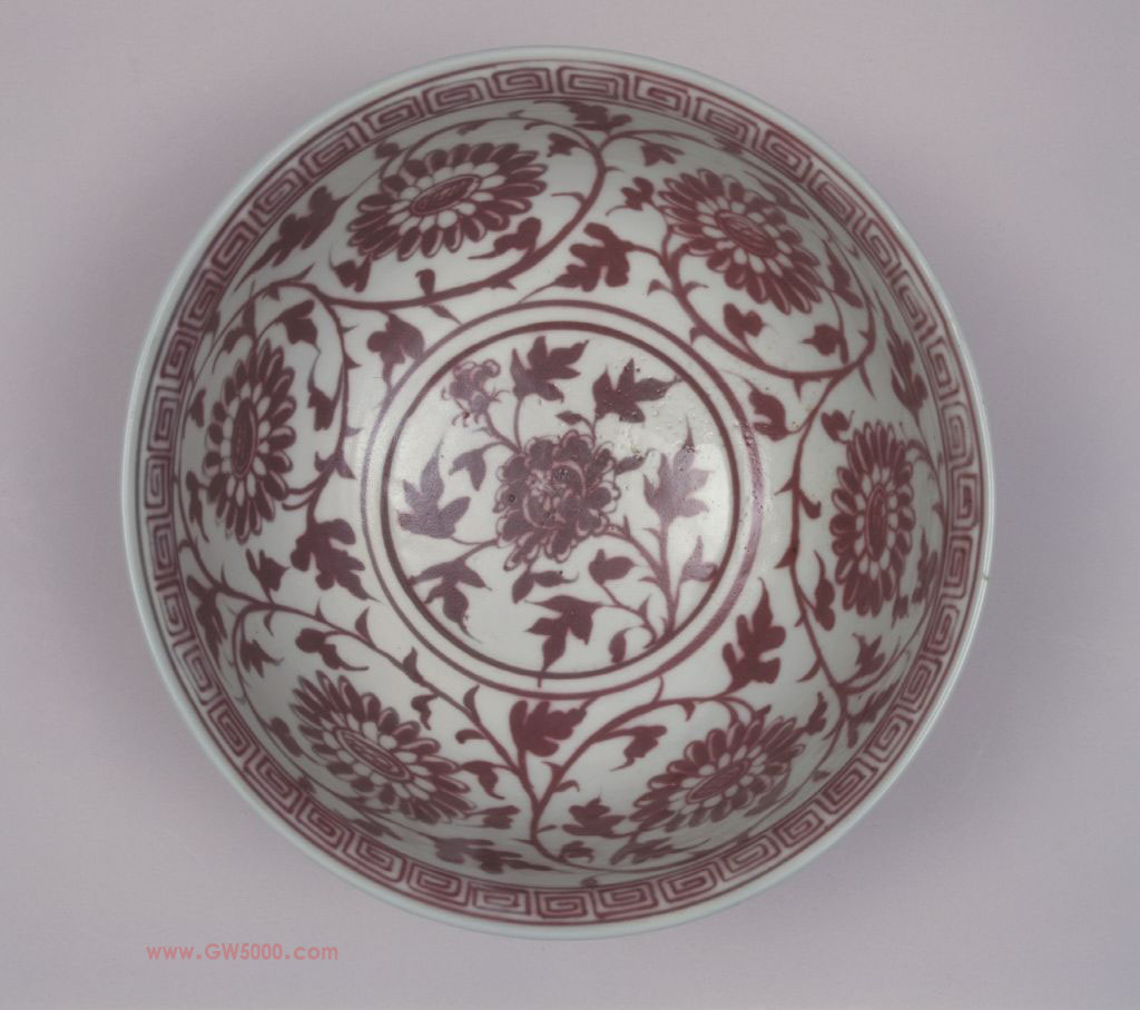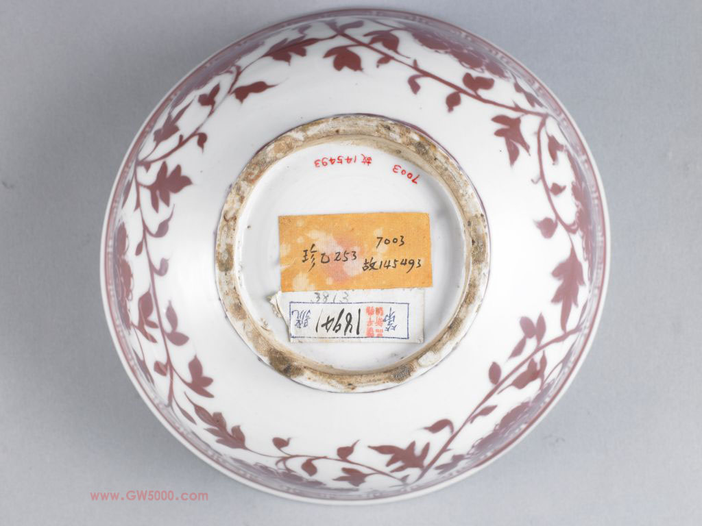 此碗的造型和纹饰构图都具有鲜明的时代风格,为洪武釉里红瓷器的代表作品。特别是其釉里红纹饰的发色,在传世或出土的洪武釉里红瓷器中,称得上较为纯正。釉下彩品种之一,系以氧化铜为呈色剂在胎上彩绘,然后施釉,经高温一次烧成。因其在釉下彩绘,故称釉里红。釉里红的白地红花,色彩鲜艳,给人以热烈喜庆的感受,自元代创烧以来,一直受到人们的喜爱。由于铜对窑室内的气氛要求严格,高温下易挥发,因此烧成难度大。元与明初的制品有些呈色不稳定。明、清时烧制的釉里红色彩稳定,且更加艳丽,尤其是清雍正朝的釉里红,不仅色泽鲜红,而且成品率高。<br>中国传统装饰花纹之一。所绘花朵系以植物的枝干或蔓藤作骨架,枝叶相互缠绕,构成四方连续或二方连续的图案,统一中寓变化。有缠枝莲、缠枝菊、缠枝牡丹和缠枝宝相花等多种纹样。