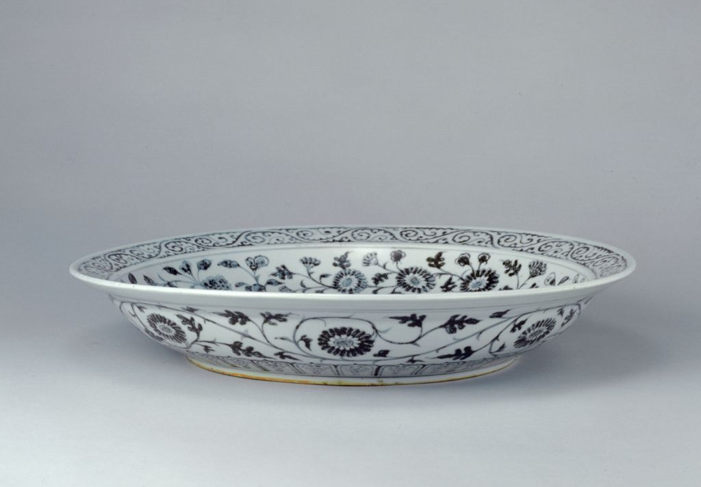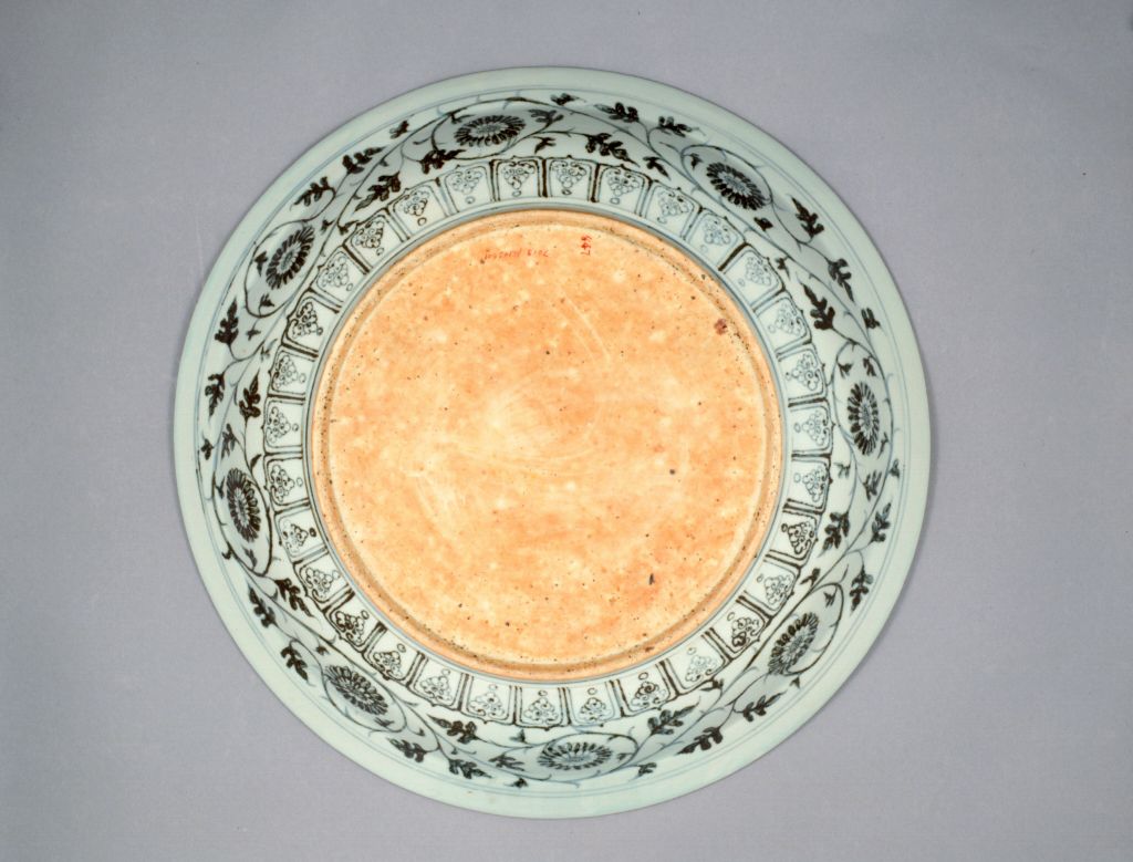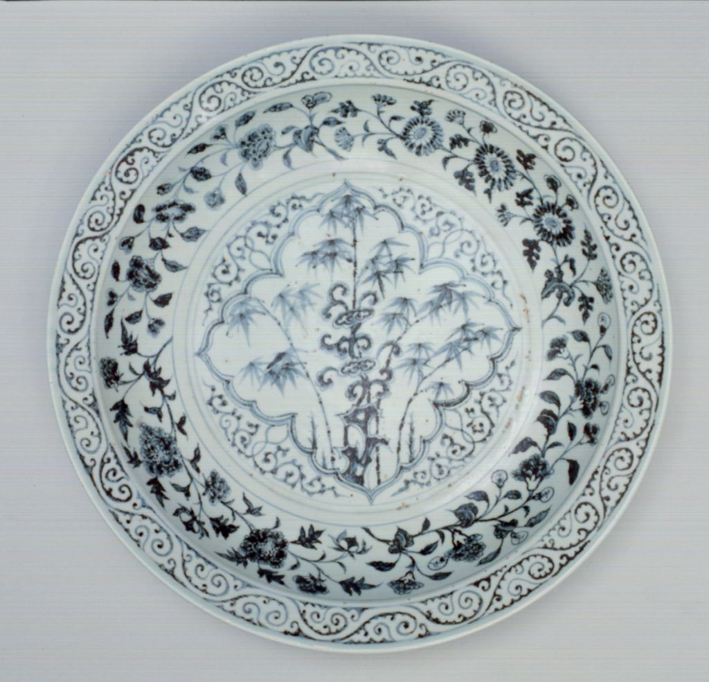 青花竹石灵芝纹盘,明洪武,高8.1厘米,口径46厘米,足径26.7厘米。