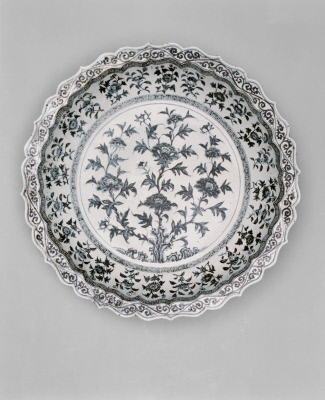 青花怪石牡丹纹菱花式盘,明洪武,高4.4厘米,口径55.8厘米,足径34.8厘米。清宫旧藏。