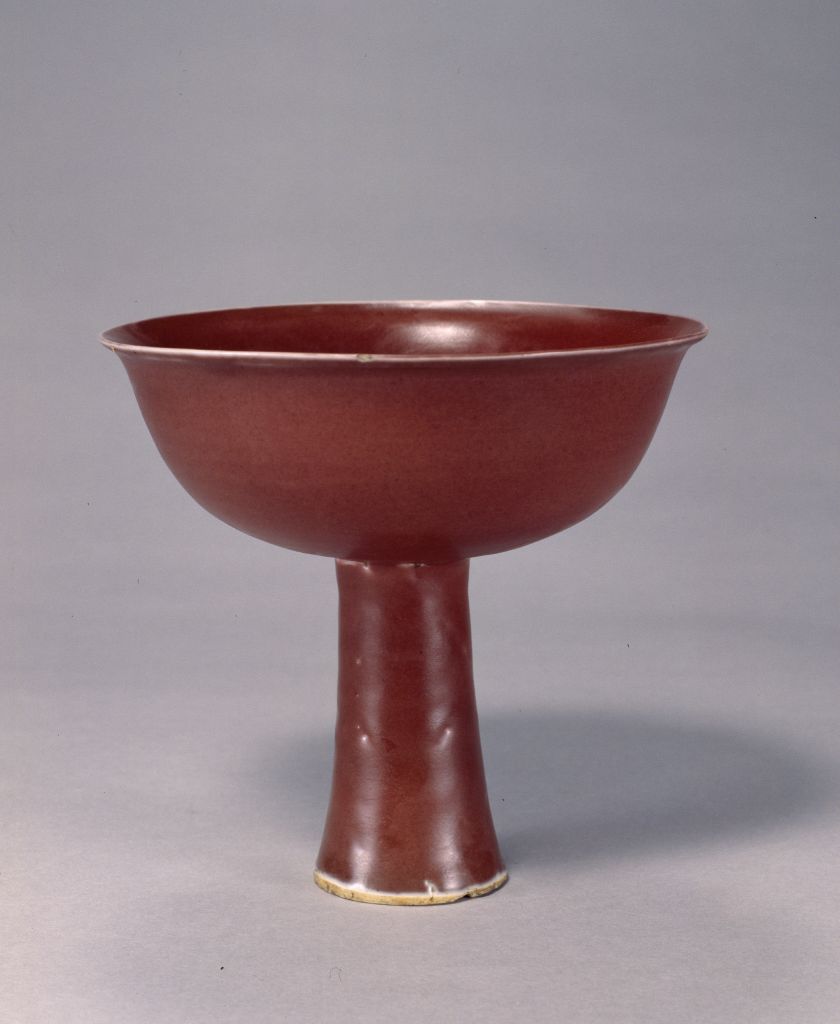 过去人们将这件红釉高足碗的年代定为元代,但随着文物考古工作的发展,新的资料不断出土,人们采用类型学的方法,从以往定为元代的瓷器中逐渐辨认出一大批属于明初洪武时期的官窑瓷器。这件红釉高足碗无论从造型、釉质还是从所饰云纹、龙纹的特征看,虽有元代风格,但又不尽相同。与元代同一类型的高足碗相比,其胎体变薄,碗的底部更瘦(香港大学冯平山博物馆:《景德镇出土陶瓷》,图版125香港大学冯平山博物馆出版,1992年)。特别是所饰云纹和龙纹,与南京明故宫遗址出土洪武官窑瓷片标本上的云纹、龙纹风格完全一致。因此,这件红釉高足碗的年代应定为明代洪武。1979年景德镇珠山曾出土这种洪武红釉高足碗的残片(香港大学冯平山博物馆:《景德镇出土陶瓷》图版188,香港大学冯平山博物馆出版,1992年)。