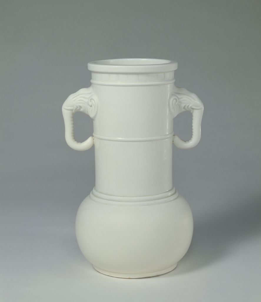 德化窑白釉象耳弦纹尊,明,高26.2厘米,口径11.4厘米,足径10.4厘米。