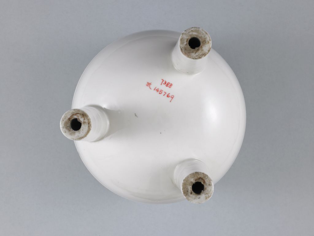 炉方唇,深腹,圜(huán音环)底,下承以三中空柱足。口沿对称置双耳。腹部两道凸起弦纹间暗刻回纹地夔龙纹,八夔龙两两相对。胎质洁白细腻。通体施白釉,釉质莹润,釉色白中略泛象牙黄色。无款识。
