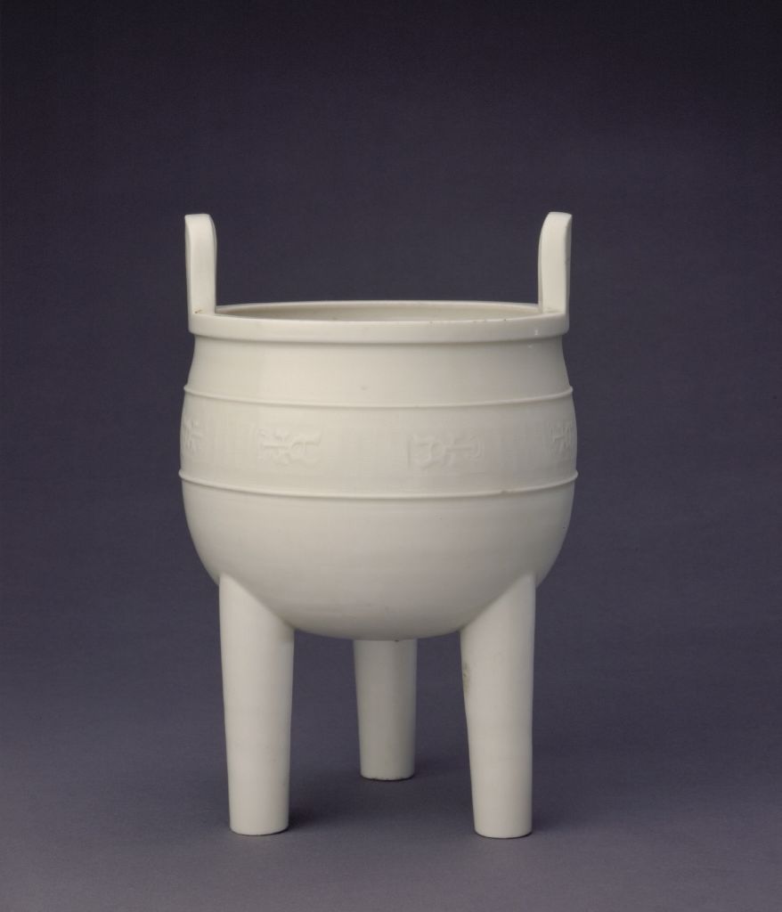 此炉非但胎、釉精美,而且以古朴的青铜器纹饰作为装饰,别具风格。古代著名民窑之一,以烧白瓷著称,窑址在今福建省德化县。宋元时已烧制青白瓷,明代主烧白瓷。其制品以人物塑像最为突出,如达摩、观音等,此外还有炉、尊、壶、乐器等器型,均名传于世。德化窑的瓷质优异,胎、釉浑然一体,色泽光润明亮,如脂似玉,洁白之中又闪牙黄,被称为“象牙白”、“猪油白”,为当时中国白瓷之代表。清代德化窑继续烧制白瓷,但产品以日用器皿为主,诸如梅花杯、八仙杯、花瓶、文具,釉色白中透青。此外,德化窑还烧制青花和五彩器。德化窑白瓷曾大量远销到日本、印度、伊朗、埃及及欧洲等国家,法国人称之为“中国白”、“鹅绒白”。