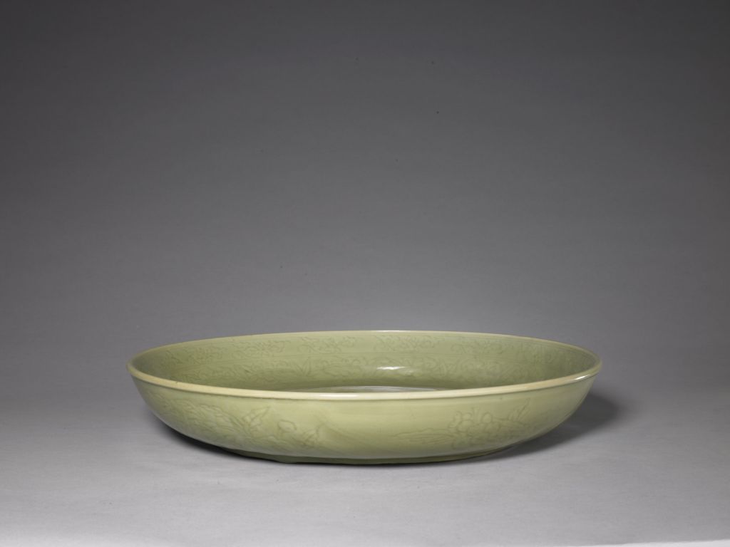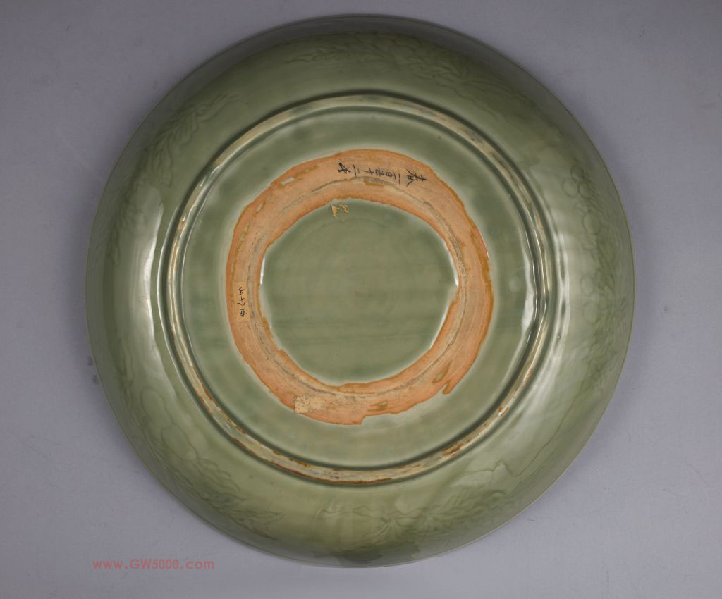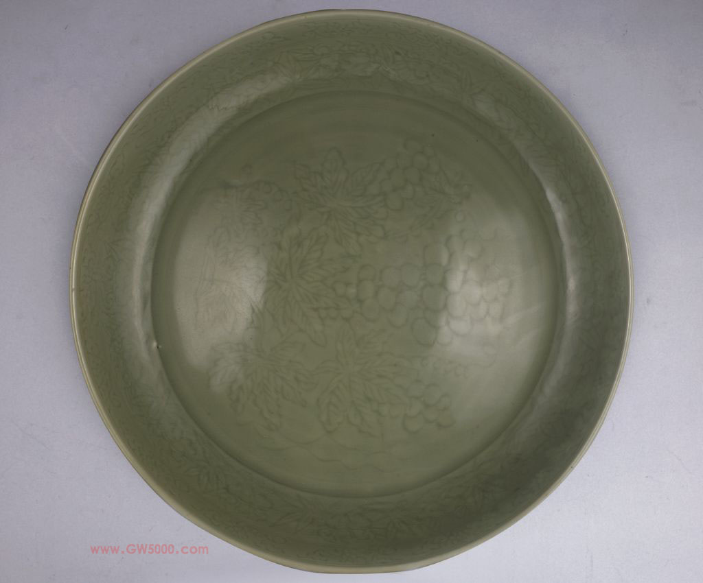 龙泉窑青釉刻花葡萄纹大盘,明,高7.5厘米,口径50.6厘米,足径33.2厘米。