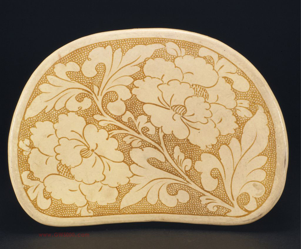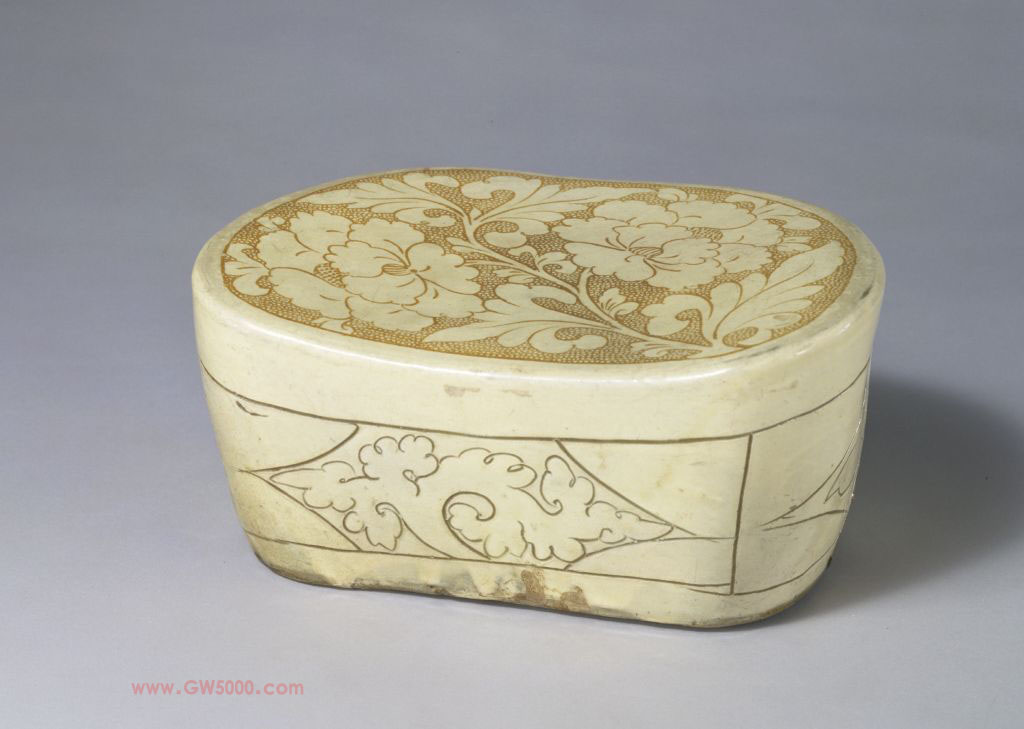 白釉珍珠地划花折枝牡丹纹枕,宋,高12厘米,长25.8厘米,宽18.4厘米。