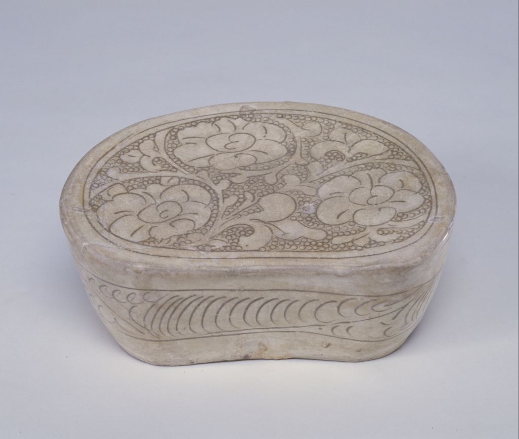 牡丹腰圆枕,宋,长22厘米,宽14厘米,高9厘米。