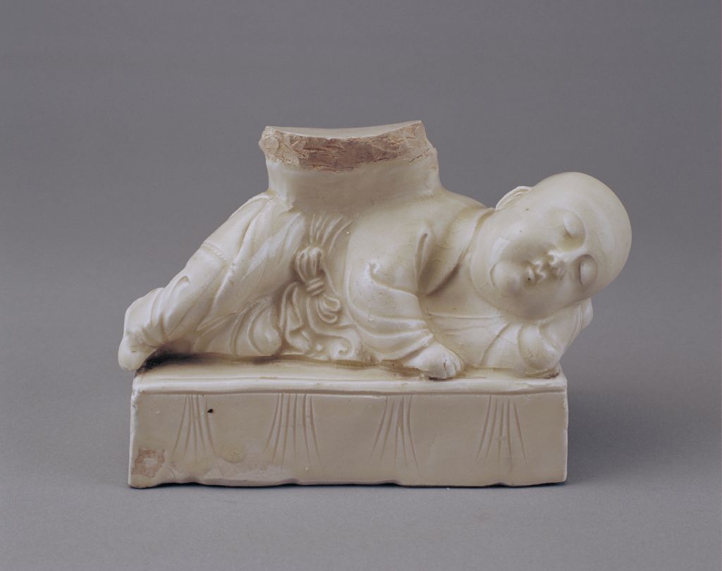 定窑孩儿枕(残),宋, 长15.2厘米,9厘米,高11厘米。