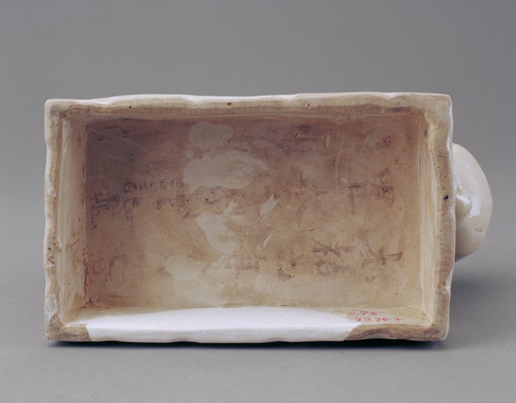 此枕长方形托座,上饰一枕臂侧卧的熟睡小童,小童双眼微合,面带微笑,腰侧为枕面,枕面残缺,只余一小部分,可见釉下印有婴戏莲花纹。托座底中空,涩胎,无釉,上有墨书“元佑元年八月廿七日置太□刘谨记此。”此枕通体施白釉,釉色温润,纹饰清晰,线条飘逸,具有北宋定窑白釉器的显著特征。“元佑”为宋哲宗年号,元佑元年为公元1086年。