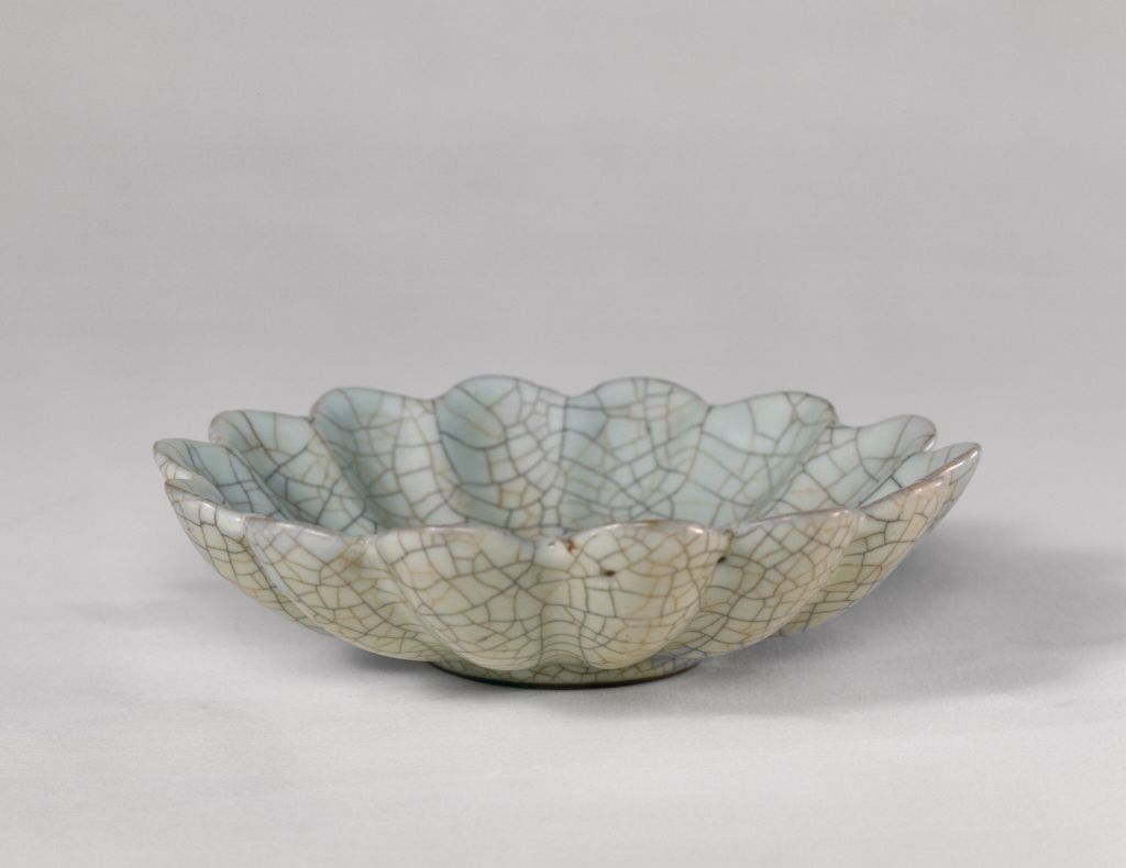 中国古代艺术家和陶瓷工匠在设计陶瓷造型时,善于从大自然动、植物中获得灵感,蛙形、虎形、葵花形、菊花形等造型屡见不鲜。这件菊瓣式盘造型规整,青灰色釉素裹,交织如网的开片纹妙趣天成,堪称古陶瓷模仿花朵造型的典范。