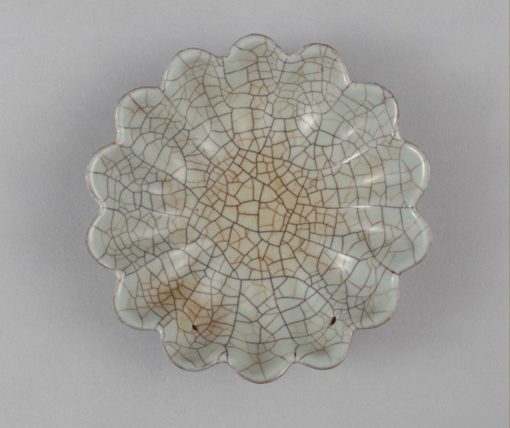 哥窑青釉菊瓣式盘,宋,高4.1厘米,口径16厘米,足径5.6厘米。清宫旧藏。