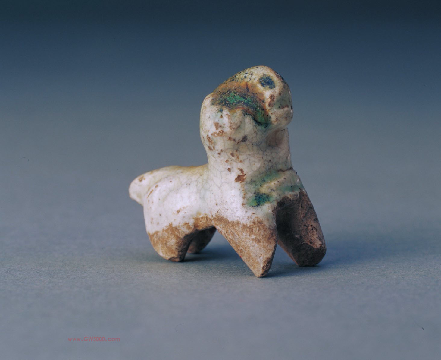 小狗昂首向前,张口吠叫,作奔跑状。通体白釉黑彩装饰。磁州窑生产的儿童玩具风格朴实自然。这件白釉黑彩狗造型小巧活泼,风格自然明快。北宋、元、金代北方地区著名的民间瓷窑之一。窑址位于河北磁县观台镇与彭城镇一带,宋代属磁州,故名。产品以白瓷、黑瓷和白地釉下黑、褐彩绘瓷为主。白瓷装饰有划花、剔花、绿斑、褐斑及珍珠地划花等。白地釉下黑、褐彩划花器是磁州窑的优质瓷,器物除瓶、缸、罐、碗、盆等日用品外,以瓷枕颇为著名,枕底往往有张家、李家、王家和陈家造等印记。图案内容除一般的花鸟禽兽外,还有各种富有生活气息的题材,清新活泼。瓷枕上往往书写宋、金流行的词牌、曲牌,如《满庭芳》、《朝天子》、《普天乐》等,开创了我国瓷器彩绘装饰的新途径,在我国陶瓷史上占有重要地位。