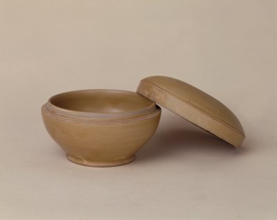 五代时期的越窑青瓷质地细腻,胎体轻薄,釉面光滑,造型趋于秀美,刻花技法更加成熟。这件越窑刻花盒为五代时的瓷器精品,器物施满釉,釉薄而匀,明显与唐代越窑不同。五代时期,更多地注重花纹装饰,刻花、印花、划花技术发展到了高度成熟的阶段。装饰题材进一步拓宽,人物、鸟兽、花草一应俱全,其莲瓣纹是越窑瓷器装饰中最有代表性的纹饰,莲瓣宽厚肥硕,有的花瓣中还有脉络,花瓣层次重叠者居多,单层者较少。此盒所刻莲瓣线条圆润,刀工犀利,技艺娴熟,富有真实感,显示出越窑装饰的发展与成熟。越窑这一名称最早见于唐人陆龟蒙的《秘色越器》诗,诗中有“九秋风露越窑开,夺得千峰翠色来”句。今人所谓越窑,系对浙江东北部宁、绍一带北宋以前瓷窑的统称。越窑制瓷渊源可以上溯至商周时期的原始瓷生产,自东汉创烧成熟青瓷后,其制瓷业不断发展,先后经历了三国、两晋、南北朝的大发展时期和唐、五代的全盛期,至北宋中期衰落,曾一度为宫廷烧造过贡瓷。所产瓷器始终以青瓷为主,汉至南朝还烧造少量黑瓷。唐至北宋时期的秘色瓷代表了越窑瓷器的最高水平。