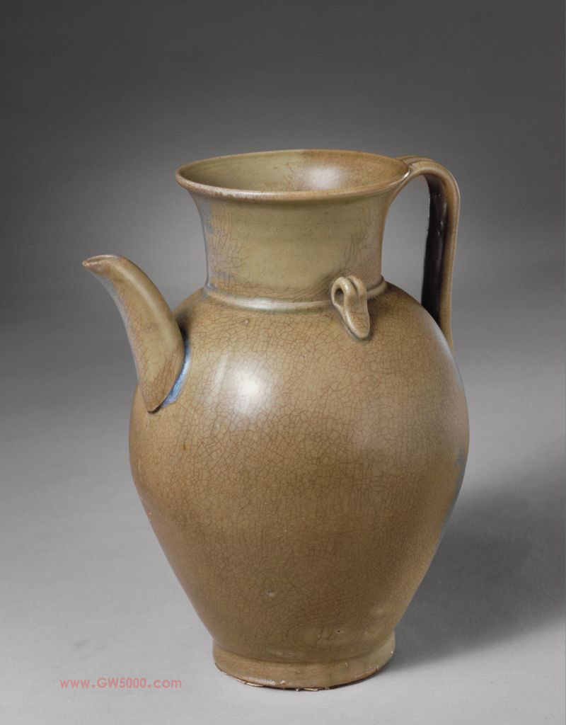 壶撇口,短颈,溜肩,长圆形五瓣瓜棱腹,浅圈足。壶身一侧置弯流,另一侧置连于口、肩之间的曲柄,肩部置对称竖系。壶内外及足内满施青釉,釉面开细碎片纹,壶流根部积釉处产生窑变现象。