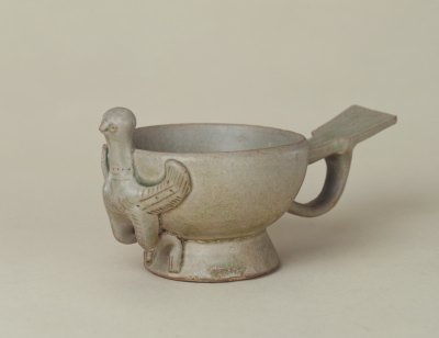 越窑鸟式杯,五代,高5.8厘米,口径7.3厘米,足径4.9厘米。