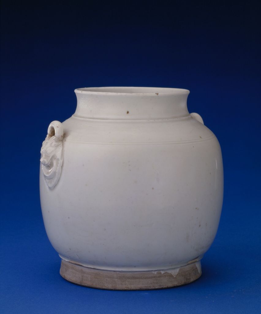 罐口外撇,短颈,溜肩,直腹,浅圈足。器里外施白釉,圈足无釉。颈下凸起弦纹一道,肩部刻划弦纹二道,两侧各塑贴一兽面衔环耳。