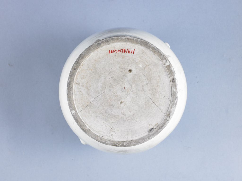 定窑白釉双系罐,五代,高13.5厘米,口径8.3厘米,足径11厘米。