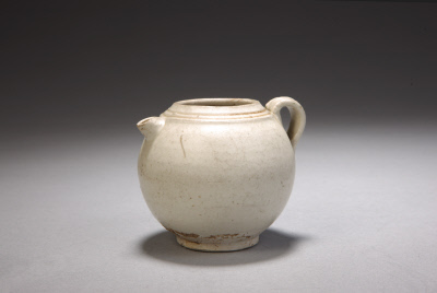 壶敛口,鼓腹,圈足。肩部一侧置一小短流,相对一侧置曲柄。通体内外施白釉,釉面均匀,釉质莹润柔和。
