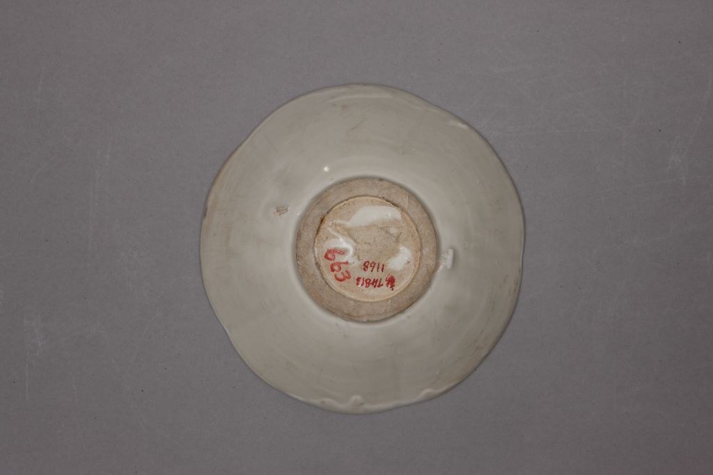 碗口呈五瓣葵花式,斜壁内收,圈足。里外施白釉,釉色白中泛青,外壁底边有不规整的垂釉痕。