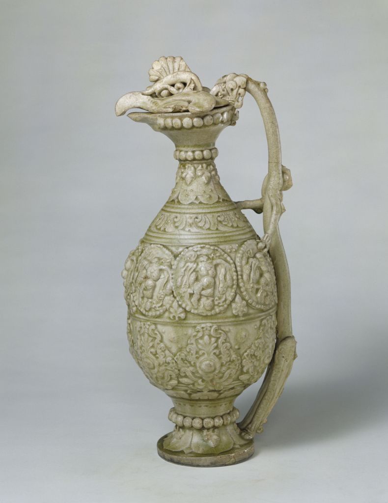 壶盖与壶口吻合成凤头状,使得壶整体颇似一只挺立的凤鸟。壶柄塑成一直立的蟠龙,龙口衔住口沿,作窥视探饮状,前肢撑于壶肩部,后肢立于喇叭形底座上。壶体以塑贴和刻划技法装饰。腹部塑贴主体纹饰两层,上为7个联珠纹圆形开光,内有手舞足蹈的力士,下为宝相花7朵。口沿、颈、肩及胫部饰以联珠纹、莲瓣、卷叶或垂叶纹。各组纹饰间以弦纹相隔。此壶胎体厚重,釉层凝厚,玻璃质感强,带有北朝以来北方青瓷的遗风。其装饰纹样繁复,结构严谨,层次清晰。