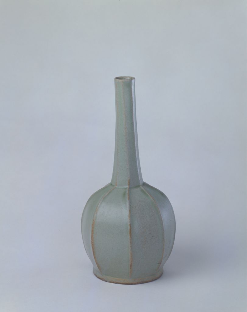 瓶直口,长颈,腹部呈八棱形,圈足外侈。灰白色胎,质致密。釉呈浅青绿色,唐人陆龟蒙诗云:“九秋风露越窑开,夺得千峰翠色来”,道出了越窑青瓷的釉色特点。
