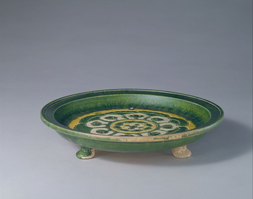 此盘造型规整,盘心图案以刻花方法填彩而成,画面呈现凹凸状,立体感强。由于采用了素烧工艺,胎体致密,釉色以绿彩为主,色调清新淡雅,在三彩盘中较为少见,堪称唐三彩器中的精品。