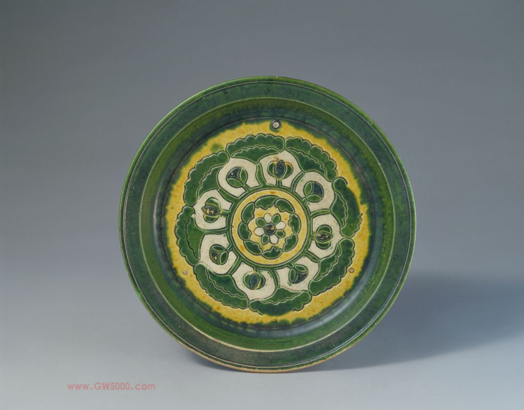 盘口为板沿式,平底,下承3足。通体以绿釉为地,盘心刻一团花,外环荷花、花蕾及荷叶纹,施以黄、绿、白三色。底无釉。
