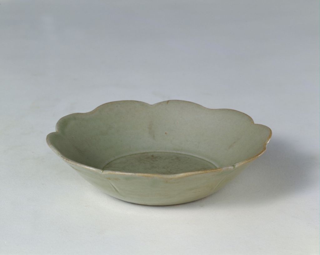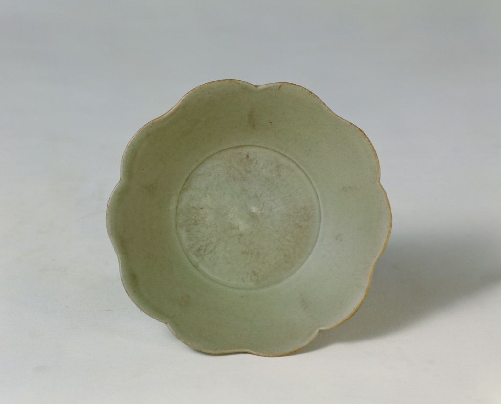 越窑青釉花瓣口碗,高3.6厘米,口径14.1厘米,足径6.5厘米。