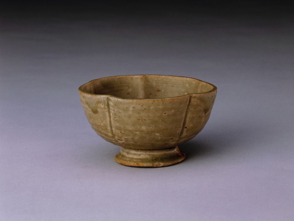 杯为五瓣花口,圈足外撇,器形小巧,釉色青润。造型仿同时期金银质地的高足杯,是晚唐时期青瓷器的流行样式,反映了当时青瓷器逐渐替代金银器的发展趋势。此种形制的瓷器至宋、元时期依然流行。瓷器釉色名。一种含铁量在1%—3%左右,经高温还原气氛中烧成,呈现青绿色泽的釉,是中国最早的颜色釉。商周时期原始瓷器的青黄釉色是青釉的初级阶段。汉代已烧制出釉色纯正的青釉瓷器。至唐代日臻完美,被誉为“千峰翠色”。宋代的粉青、梅子青如同青玉,色泽与质感之美达到顶峰。明清之际,永乐朝的翠青、冬青(即东青),雍正朝的粉青、豆青等均色调匀净,苍翠欲滴,烧制水平已臻于炉火纯青的境界,出现了很多名贵品种。