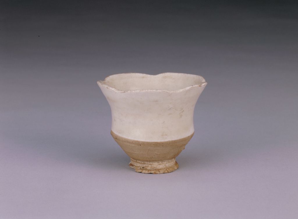 白釉葵瓣口杯,高6.2厘米,口径7.5厘米,足径3.4厘米。