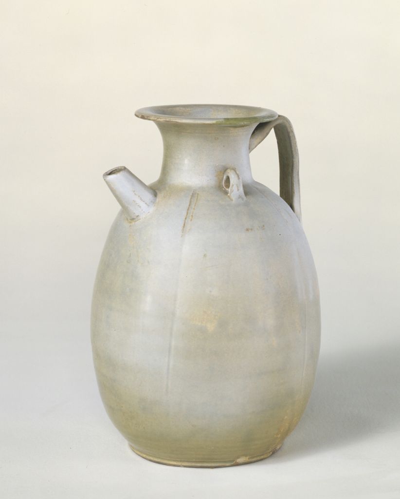 此执壶造型圆润饱满,釉质润泽,为唐代晚期越窑青瓷的代表作品。