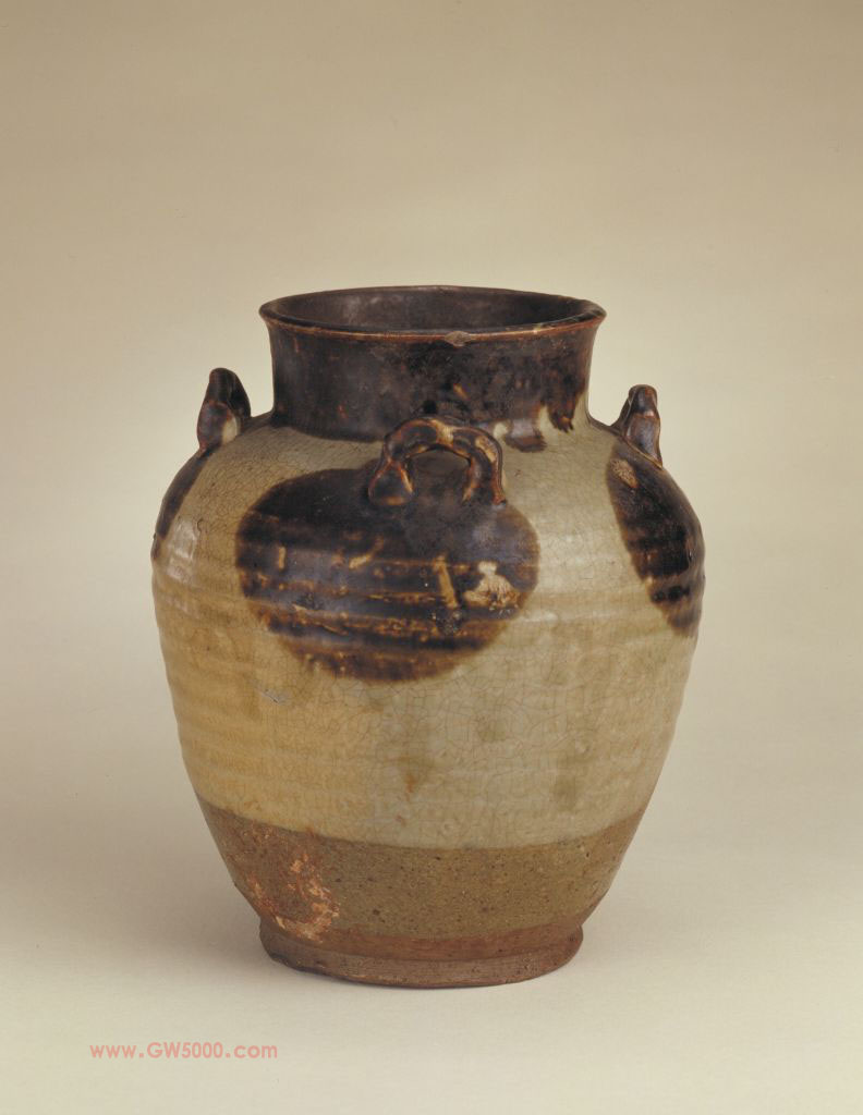 邛窑青釉褐彩四系罐,唐,高18.2厘米,口径9.8厘米,底径9.2厘米。