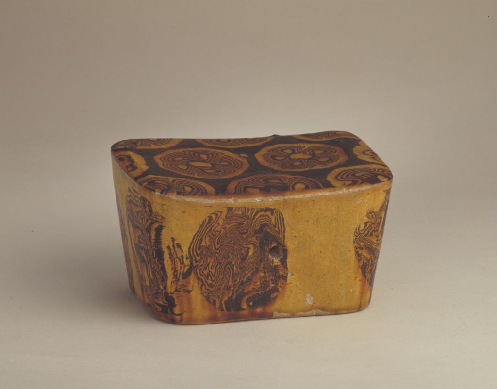 巩义窑绞胎枕,唐,高8厘米,长12.5厘米,宽8.8厘米。